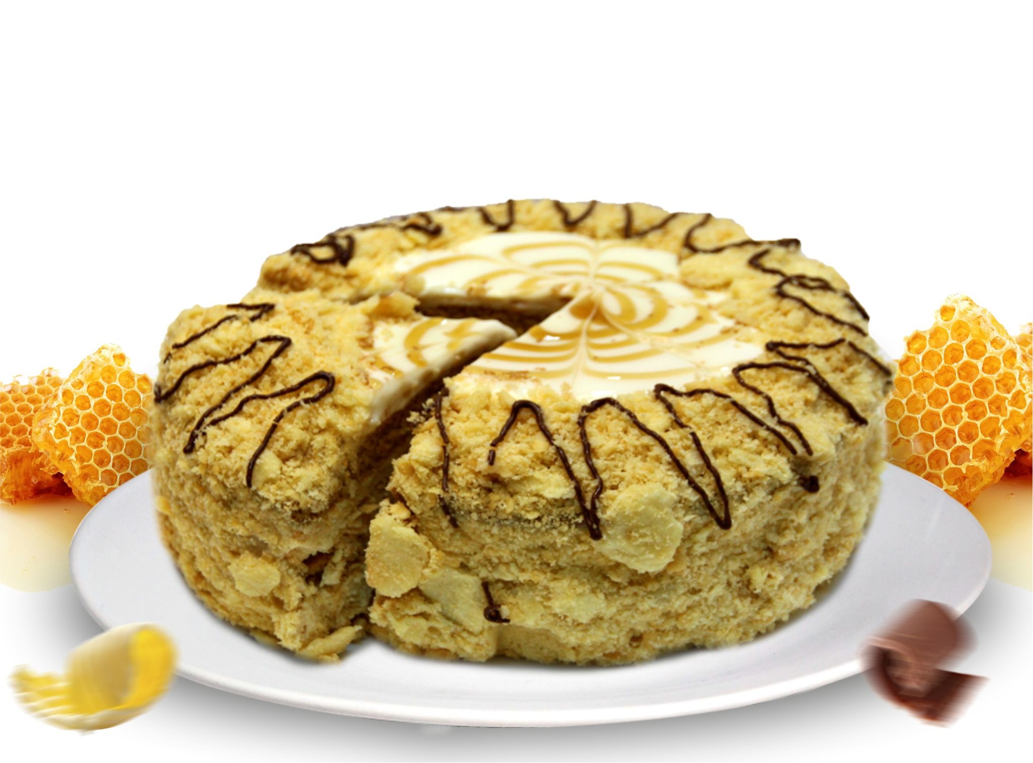 Описание: Слои медовых коржей соединены заварным кремом. Торт декорирован медовой крошкой.