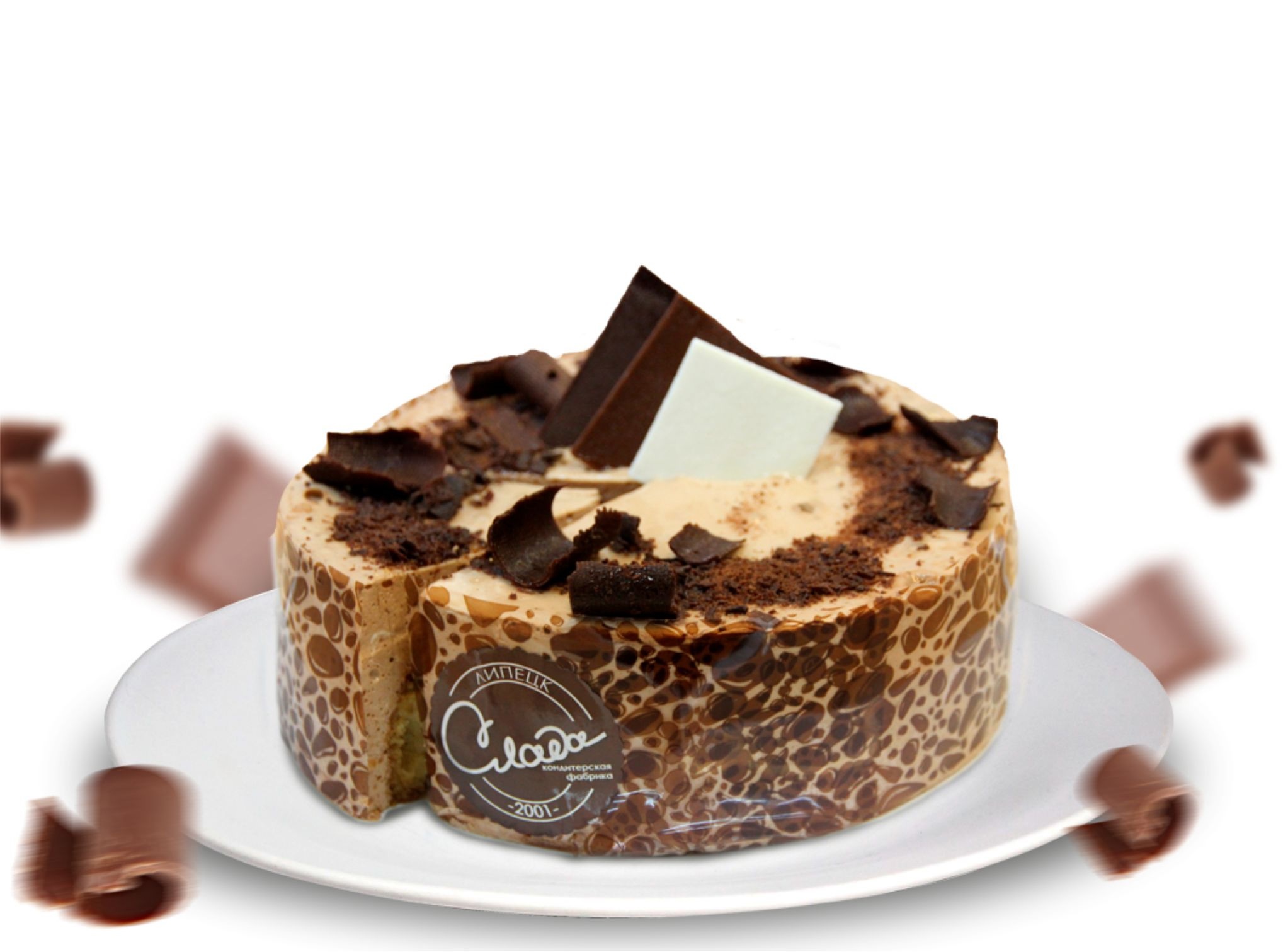 Описание: Слой классического бисквита пропитан сиропом и соединен шоколадным суфле. Торт декорирован гель – нейтральный и шоколадная глазурь.