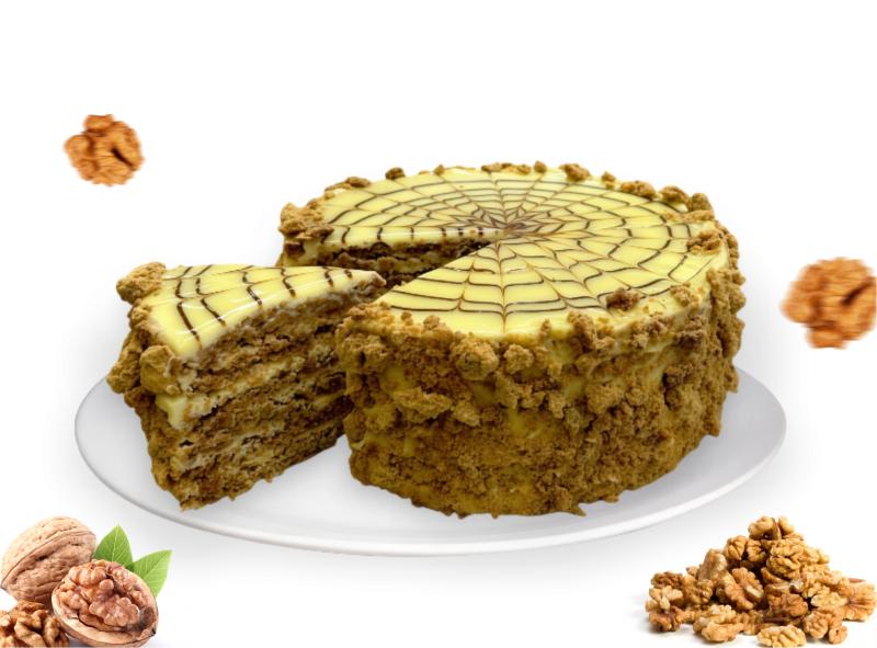 Нежные белково‑ореховые коржи с дроблёным грецким орехом, одновременно хрупкие и тающие во рту, соединены с насыщенным заварным кремом на молоке с добавлением сливочного масла. Торт покрыт глазурью, поверх которой тонкой струйкой шоколада выписан фирменный узор — «паутинка».