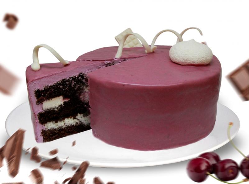 Крымский – слои шоколадного бисквита соединены творожным кремом и начинкой из вишни. Торт декорирован сливочным кремом и ягодно-шоколадным покрытием.