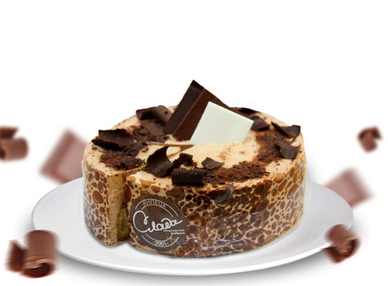 Мокко – слой классического бисквита пропитан сиропом и соединен шоколадным суфле. Торт декорирован гель – нейтральный и шоколадная глазурь.