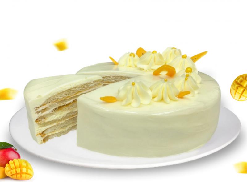 Тонкие коржи на сгущенном молоке чередуются с сырным кремом и сочной начинкой из манго. Декор из прозрачного геля подчёркивает естественную красоту торта, а шоколадный декор добавляют элегантности и стиля. Этот торт — истинное наслаждение для ценителей изысканной выпечки. Он покорит вас своей нежностью, сочностью и гармоничным сочетанием вкусов.