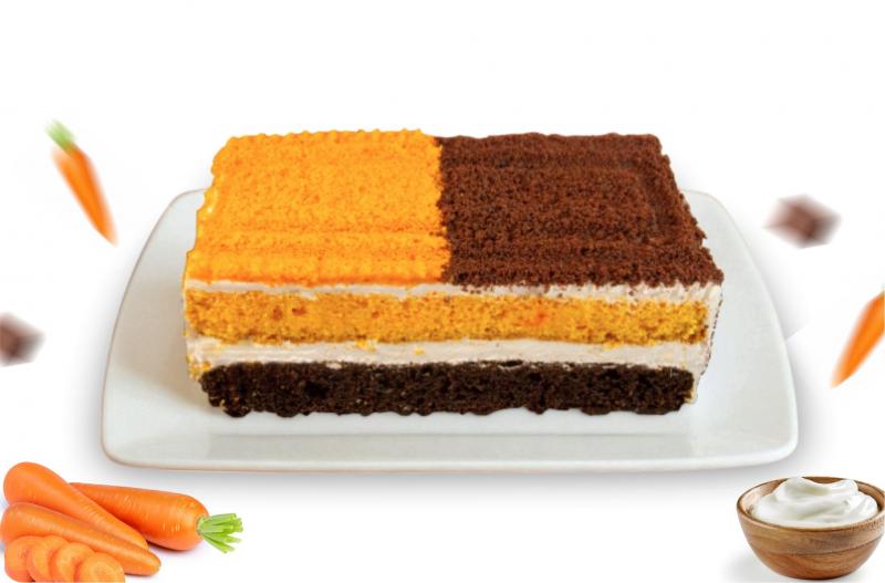 Семейный – слои морковного и шоколадно-масляного бисквитов соединены сметанным кремом. Торт декорирован двумя видами бисквитной крошки.