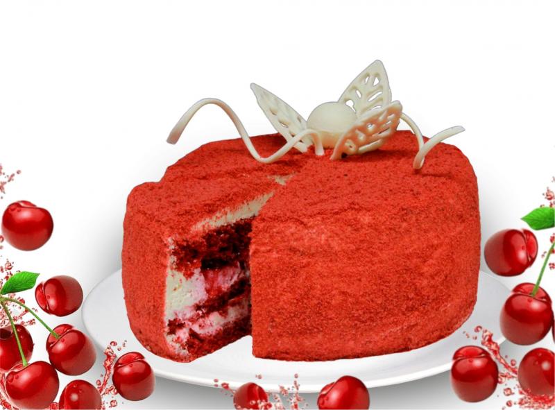 Вес: 1000 гр. Шарм – слои бисквита «Красный бархат» соединены между собой сырным кремом «Креметто» и фруктовой начинкой из вишни. Поверхность украшена крошкой бисквита «Красный бархат».
